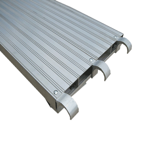 Aluminum scaffold boards offer a lightweight, high-strength decking alternative to traditional wood planking for frame and system scaffold platforms. Extruded aluminum construction keeps handling weight low without sacrificing load capacity, while hook ends lock securely onto frame cross members to prevent shifting. A ribbed walking surface provides reliable traction in wet or dirty conditions, and unlike wood, aluminum won’t rot, split, or absorb moisture over time. Available in multiple lengths to fit standard bay configurations.