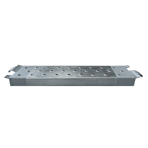 Flat hook steel scaffold plank that sits flush on scaffold frame cross members, providing a low-profile, stable walking and working surface. Hooked ends on each side grip the frame rails to hold the plank firmly in position and prevent lateral movement during use. Perforated tread holes across the deck surface promote drainage and traction in wet or dirty jobsite conditions. Galvanized steel construction won’t warp, split, or deteriorate like wood decking, offering significantly longer service life with minimal maintenance. A practical, heavy-duty decking solution compatible with standard frame scaffold setups.