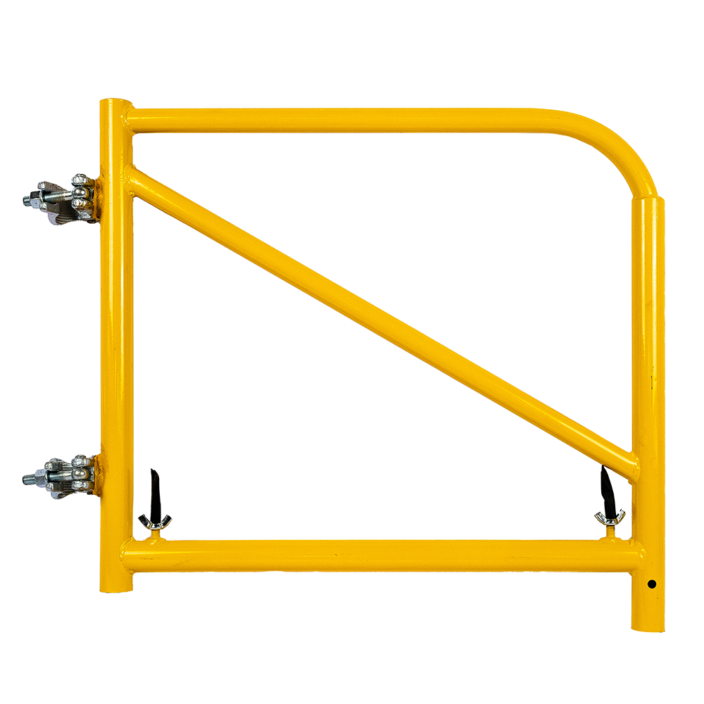 Steel scaffold outrigger, designed to widen the support base of frame scaffold systems for added stability on uneven or elevated setups. A welded diagonal brace within the frame provides rigid triangulation that resists tipping and lateral sway under working loads. Bolt-on clamp fittings secure the outrigger firmly to the scaffold frame legs without permanent modification, allowing quick installation and repositioning as needed. Yellow powder-coat finish over welded steel construction offers durable weather and corrosion resistance. Accepts standard base plates or screw jacks at the bottom connection point for leveling on varied terrain. An essential safety component for freestanding scaffold towers and end-of-run configurations.